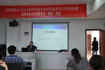 2014年9月23日上午,四川大学公共管理学院副院长夏志强教授应邀为我院师生作了一场题为“经济体制改革的逻辑”的学术讲座。此次讲座是我院主办的公共管理学院“格致”讲堂第6期,由我院副院长王志凌教授主持,学院师生聆听了此次学术报告。
