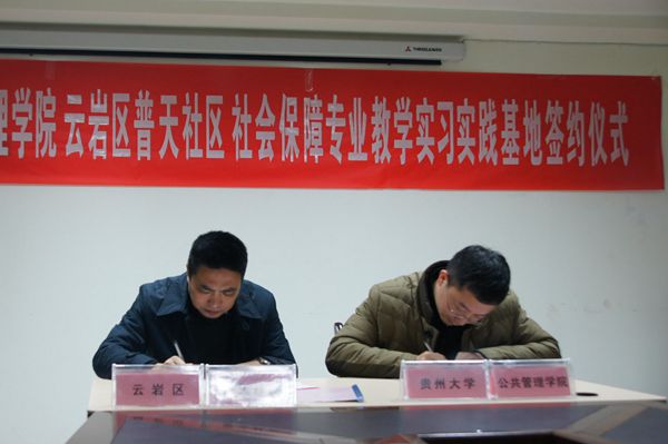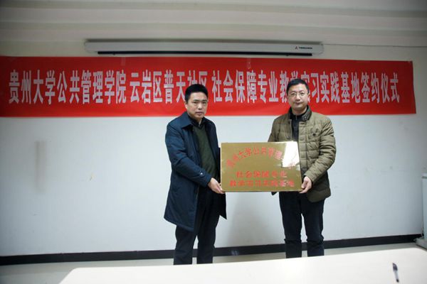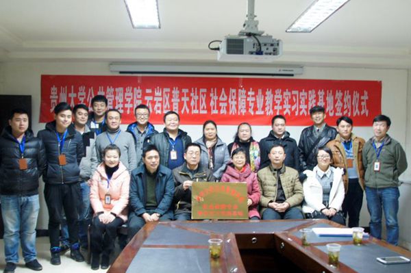 本网讯(社保系供稿 新闻中心 尤瑜 报道)1月8日下午15时,贵州大学公共管理学院与云岩区普天社区服务中心签署了《建立社会保障专业教学实习实践基地协议书》,签约暨揭牌仪式在云岩区普天社区服务中心举行,贵州大学公共管理学院党委书记李波、院长黄其松、劳动与社会保障系主任高圆圆及公共管理学院教师一行9人出席此次实习基地签约揭牌仪式。云岩区普天社区党委书记于刚、云岩区普天社区服务中心涂当海主任以及社区其他领导干部应邀参加仪式。仪式由云岩区普天社区党委副书记金舸主持。