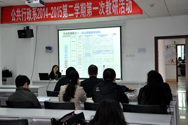 本网讯(新闻中心梁源 张燕子 报道|摄影梁源)4月23日下午,我院公共行政系2014—2015第二学期第一次教研活动在信息楼710举行。学院黄其松院长,刘明锋副书记,教学科研科汪涛老师、文家凤老师,公共行政系冯媛媛老师,安志放老师、吴声凤老师、段忠贤老师、杨志军老师、国际教育学院Mats Sundin等参加本次活动。