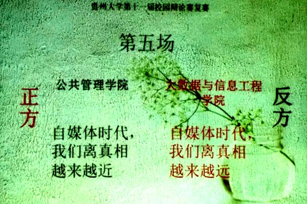 本网讯 (新闻中心 尤瑜 刘华玉 报道|摄影 张昱)5月9日下午,我院辩论队参赛贵州大学第十一届辩论赛16进8比赛。正方(公共管理学院)辩题是“自媒体时代,真相离我们越来越近”,反方(大数据与信息工程学院)辩题是“自媒体时代,我们离真相越来越远”,双方以此展开辩论。校团委副书记吕槐乐等三人担任评委。我院40余人前往加油。