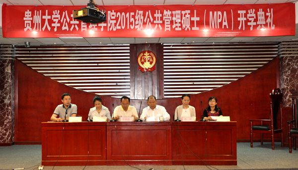 本网讯 (新闻中心 李贝贝 报道|摄影 腾朝辉) 5月15日上午,公共管理学院2015级公共管理硕士(MPA)开学典礼在北区信息楼模拟法庭举行。贵州大学公共管理MPA教育指导委员会主任任钢建,贵州大学副校长、研究生院院长赵德刚,贵州大学研究生院常务副院长杜滨,贵州大学党委研究生工作部部长陈莉琼,贵州大学公共管理学院党委书记李波,院长黄其松,副院长王志凌等领导出席本次典礼。此外,80名MPA学员参加了开学典礼。典礼由黄其松院长主持。