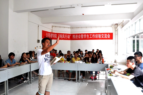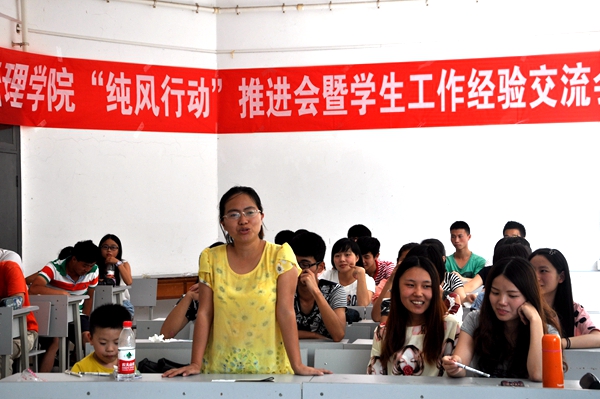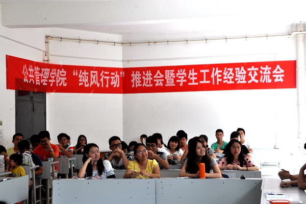 本网讯(新闻中心 李石磊报道|摄影 张昱)7月11日下午14:00公共管理学院“纯风行动”推行会以及团委学生会工作经验交流会在北区博学楼311教室举行。出席此次会议的有学生科科长崔永霞、团委学生会青协主席团成员、各部门的部长副部长及各部的干事。此次会议的目的有三:对学风、考风进行讲解;第三学期的安全问题进行强调;各部门派出代表与大家交流这一年来的工作经验。