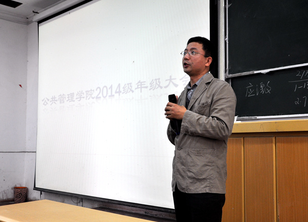 本网讯(新闻中心实习记者王金利报道|摄影张立力)9月28日中午,我院在北区逸夫楼515教室召开了“公共管理学院2014级年级大会”。院党委书记李波、院长黄其松、副书记刘明锋、副院长许鹿出席,学生科崔永霞、董淑琴、韩飞老师,教学科研科科长汪涛、文家凤老师以及我院2014级247名学生参加了本次年级大会。