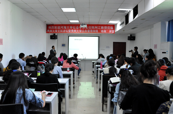 本网讯(新闻中心 实习记者 陈娜 报道|摄影 李石磊)11月6日下午,由哲学社会科学研究院主办、公共管理学院承办的贵州大学总第288期文科讲坛在慎思楼710室举行。本次报告会特邀河海大学社会科学系主任、博士生导师陈阿江教授来我校作题为《论人水关系》学术报告。贵州大学公共管理学院副院长许鹿老师主持讲座,社会学系相关老师和学生参加了此次讲座。