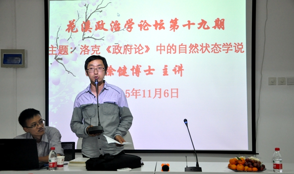 本网讯(新闻中心 实习记者 胡顺书 报道|摄影 李科庆)11月6日晚,由彭卫战主任负责策划,徐健博士主讲的“花溪政治学论坛”在我院710会议室顺利举行。论坛的主题为洛克《政府论》中的自然状态学说。博士生导师刘锋出席,王进、朱兵、杨达、王勇、卢正涛、胡治宇、杨沛艳、胡蓉、丁玲九位博士以及政治学系五十多名研究生参加了本次论坛。