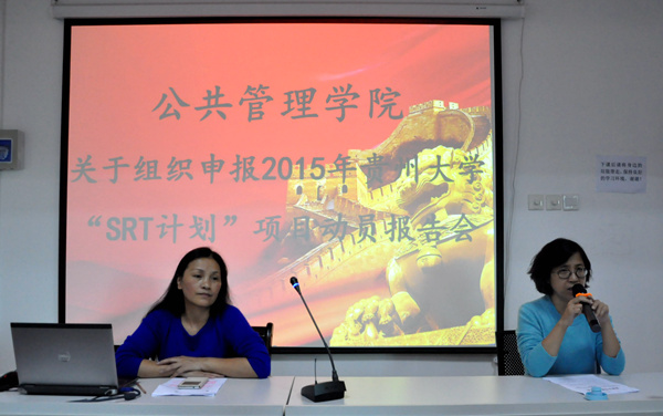 本网讯(新闻中心 李科庆 实习记者 李佳霜 报道|摄影 李石磊 实习记者 胡顺书)为了对2015年“SRT计划”进行广泛宣传与动员,培养学生参与该项目的积极性。我院分别于11月23日和25日下午在慎思楼710会议室举行关于组织申报2015年贵州大学“SRT计划”项目会议。副院长许鹿、教学科研科汪涛老师、文家凤老师,段忠贤老师出席,我院50余名学生参加此次报告会。