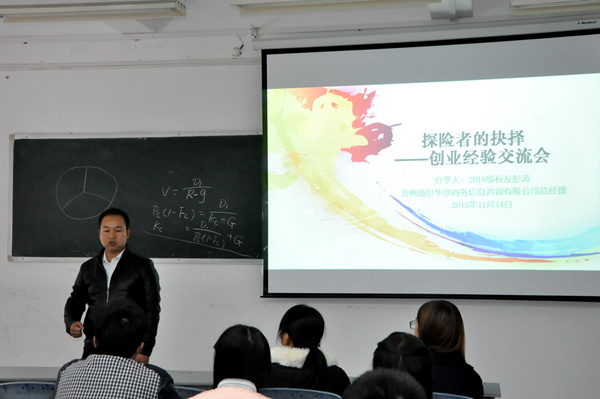 本网讯(新闻中心 李石磊 摄影报道)“要成功,先努力,不顾一切向前冲”。11月14日下午,2010届优秀毕业生彭涛应学院邀请在博学楼216为公管学子作“创业、选择”经验主题交流会。30余名同学到场聆听演讲并同主讲进行相关创业思维的交流。