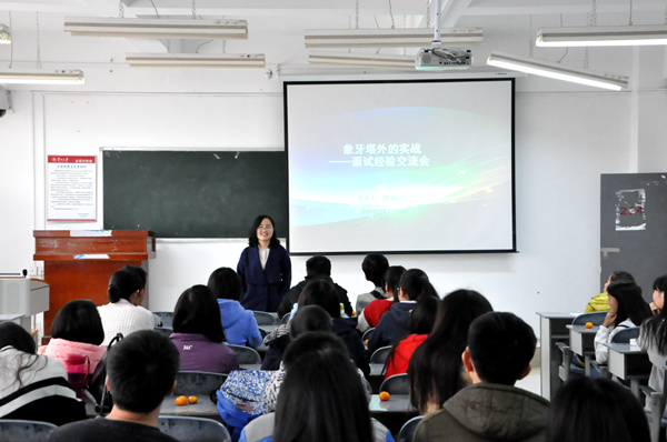 本网讯(新闻中心 胡顺书 摄影报道)江山代有才人出,面试不断易新颜。为帮助同学熟悉面试程序,提高面试技能。11月14日,2010届优秀毕业生聂婷、曾以林应邀回母校为公管学子作面试经验主题交流会。60余名同学与主讲人在博学楼217进行交流。