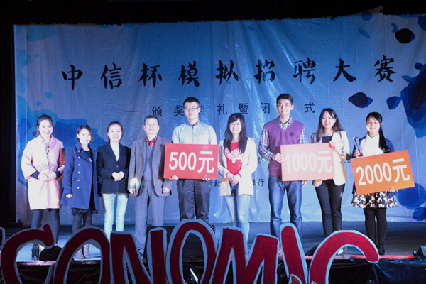 本网讯 4月24日晚,由经济学院主办的“中信杯”模拟招聘大赛圆满落幕。模拟招聘大赛主要是为在校大学生和毕业生提供一个接触社会、直面企业、身临职场的机会,帮助大学生掌握正确的求职技巧,进一步提升大学生的就业能力。决赛场上,面试官们接二连三地进行招聘提问,经过激烈的角逐后,我院信访121专业夏赛楠同学在比赛中表现突出,反应快速,获得了现场评委和同学们的阵阵掌声,经过现场评委评选,荣获2016年“中信杯”模拟招聘大赛一等奖。