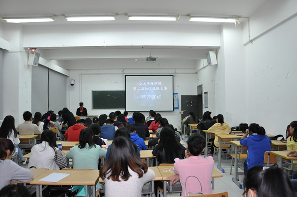 本网讯(新闻中心 杨贵园 报道|摄影 刘贵生)2016年4月28日晚,公共管理学院第二届知识技能大赛——即兴演讲初赛在博学楼130教室举行。此次即兴演讲比赛共有15位来自公管学院的同学报名参赛,比赛由城管141腾朝辉同学主持,来自公管学院的8位同学担任本次比赛评委。