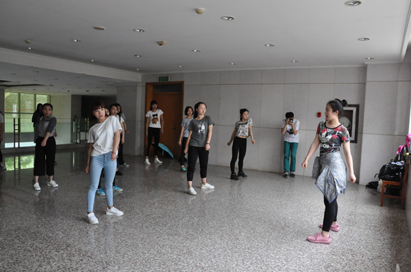 来自公管学院的大学生志愿者讲师郭欢璐在二楼楼梯口根据音乐的节奏跳起了一放一收的有氧舞蹈,通过反复训练组合动作的方式使学习者掌握有氧舞蹈的技巧,不仅使大家学习到舞蹈知识还能提高自身的心肺功能。