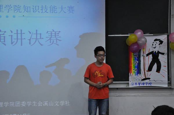 9位选手抽取演讲主题后经过半小时的准备,依次上台演讲。每位选手演讲方式独特、风格各异。来自城管131班的7号选手李丹姣的题目是:纸上得来终觉浅,绝知此事要躬行——实践的重要性。她首先浅析实践的本质即为做,并且解释:“人生就是一道做与不做的选择题,而我们的选择只有做。”随后她从做与不做两种选择所产生的影响出发,述说人为什么要选择做这一选项。她逻辑严密的演讲获得了台下阵阵掌声与喝彩。另一位8号选手腾朝辉以“站在烦恼里仰望幸福”为题,首先阐述自己对题目的认识——可以接受自己目前的困境,但是却看得见希望。接着将爱情、友情、亲情三种感情结合自身经历发声:“幸福之所以如此珍贵,因为来之不易。”之后的观众互动环节当中,劳保141班的杜威同学提到曾轰动网络的“魏则西事件”。他说:“自媒体的发展让魏则西得到了全网关注,并引起了官方媒体的自我反思。”从而引出他对自由的见解:“我们需要的不仅仅是一个自由讨论的网络平台,而是源于内心真正的自由。”