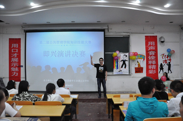 本网讯(新闻中心 杨清清 报道|摄影 袁德悦)5月11日晚,由公共管理学院主办,溪山文学社承办的“用口才展示魅力,用声音诠释精彩”第二届知识技能大赛——即兴演讲决赛在逸夫楼114室举行。公共管理学院党委书记李波、党委副书记刘明峰、学生科崔永霞老师、杨志军博士出席了本次决赛。李波书记、杨志军博士与学生詹召芮担任本次评委。