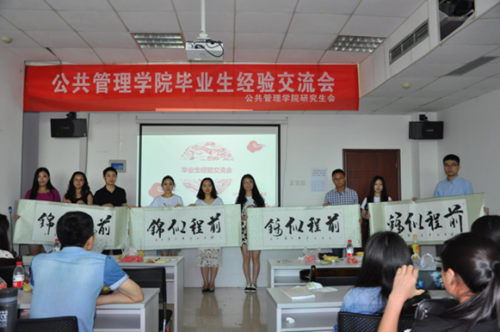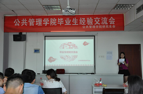本网讯(研会宣传部 张胜禹 报道摄影)6月5日下午,由公共管理学院研究生会主办的2016年公共管理学院毕业生经验交流会在贵州大学慎思楼710室拉开帷幕。2012级研究生万伟,2013级研究生靳佩鑫、罗吉和王岚出席本次交流会并与同学们分享自己在工作、求职、考博、考公务员四个方面的心得与感悟。研究生科科长秦虹老师应邀出席本次交流会。公管学院研究生会主席张爽担任主持。