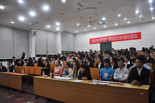 公共管理学院第一届第三任团委副书记顾琼、学生会主席杨庆彬、青协主席杜茹媚作工作报告,提请大会审议并获全场鼓掌通过。学生会副主席覃应飞宣读了贵州大学第一届第四次团员代表大会暨学生代表大会委员选举方法。