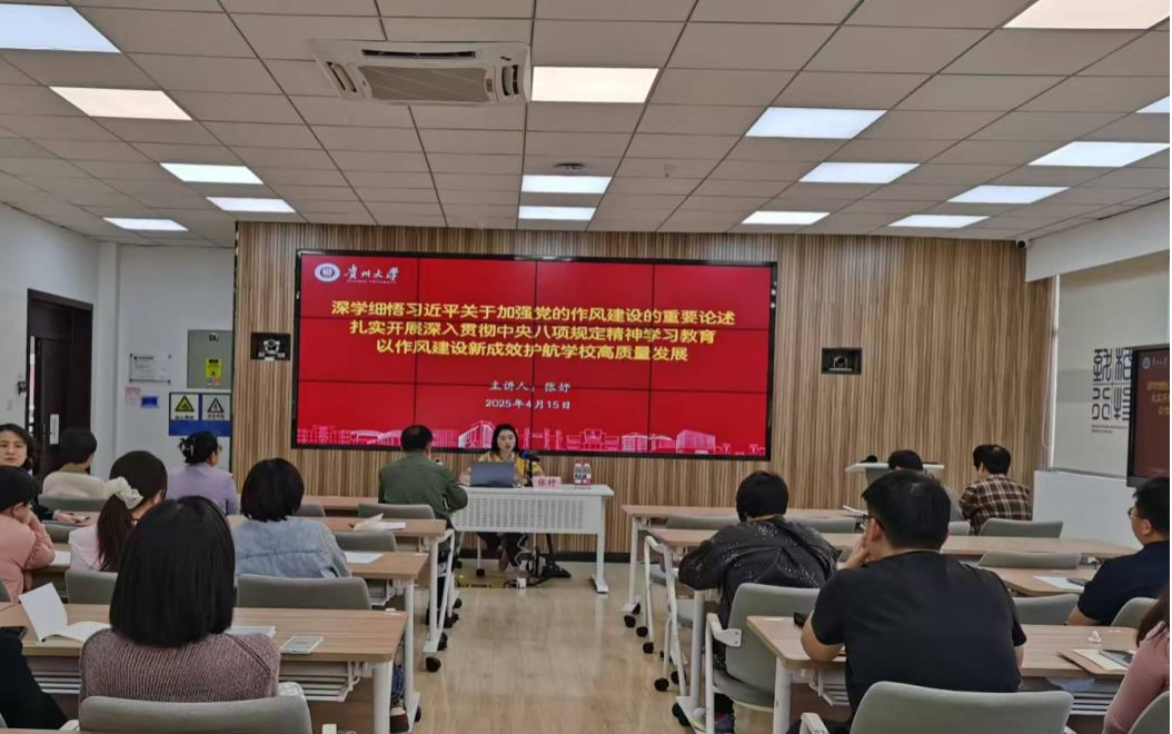 2025年4月15日,贵州大学公共管理学院深入贯彻中央八项规定精神学习教育读书班开班。会议由贵州大学公共管理学院党委书记王斌同志主持,校纪委副书记张妤在读书班上作专题辅导报告,公共管理学院全体党员教师参加会议。