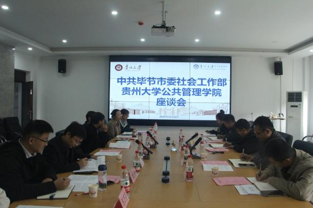 2025年11月4日,中共毕节市委社会工作部部长文超一行莅临公共管理学院进行调研座谈。贵州大学党委副书记彭洁出席并讲话。双方围绕深入学习贯彻党的二十届四中全会精神,全面落实党中央、国务院、省委、省政府关于社会工作人才队伍建设和基层社会治理现代化的战略部署,就社会工作专业学科建设、人才培养、基层治理现代化等议题进行了深入探讨。双方计划依托贵州大学在社会工作学科和人才方面的优势,协同推进社会工作专业人才队伍的高质量发展,稳步推进基层治理现代化的创新实践。