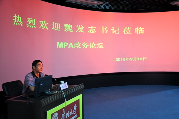 本网讯(李石磊 报道|摄影 梁源)9月19日下午,我院邀请贵阳市委群工委常务副书记魏发志在慎思楼为MPA学员作“社会治理和群众工作探索”专题讲座。学院党委书记李波、院长黄其松、MPA中心办公室主任汪磊和MPA学员近100人出席。