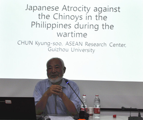 本网讯(研会宣传部 张胜禹 报道|摄影 朱复明)5月10日晚7:00,由贵州大学东盟研究院和公共管理学院共同主办的“二战时期菲律宾的华人社会”的专题讲座在慎思楼710室举办。讲座有幸邀请到韩国首尔大学名誉教授、贵州大学东盟研究院特聘教授全京秀作主讲。贵州大学东盟研究院副院长龙异担任主持,东盟研究院办公室老师梁瑶担任翻译。我院100余名研究生及本科生参加此次讲座。