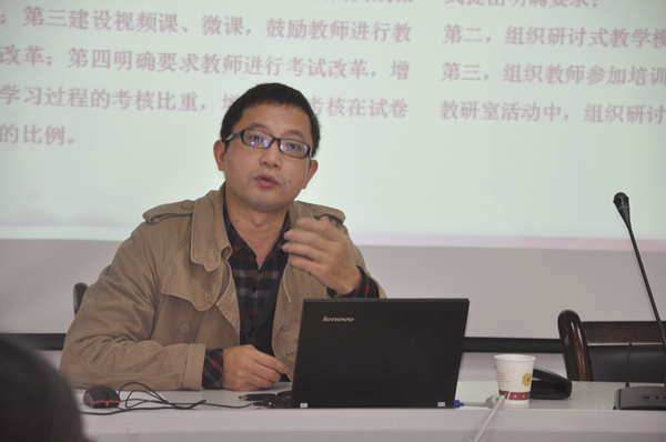 评估活动分为三个环节,第一个环节是公共管理学院院长黄其松教授就公共管理学院本科教学工作进行总评汇报。黄院长从办学定位、专业人才培养目标与确定依据、落实人才培养中心地位的措施三个方面来阐述学院的定位与目标,坚持把学生培养成“敢担当、能适应、善工作”的人才。从数量与结构、教育教学水平投入、教师教学能力的提升措施三个方面介绍学院的师资队伍,学院坚持教授上课的原则,通过教学团队建设、教学改革、举办讲坛、开展学术交流会的方式来提升教学能力,加强与政府部门和其他院校的学术联系。谈到教学资源时,黄院长说,公共管理学院的硬件设施目前只有一个社工实验室,管理综合实验室和决策模拟实验室还在建设当中,学院有七个专业,现有六个专业在招。各专业的教学活动通过课程归属专业、大类教学、“长学期教学,短学期实践”的方式开展。近年来学院也在通过各种渠道引进合作办学、合作育人、合作就业、合作发展等社会资源项目。在学生的培养过程中,学院把研讨式教学模式、外校名师观摩课、视频课程、微课、第二课堂和校内、校外实践教学等多种培养方式作为本科生的培养模式。学生发展方面,黄院长介绍了2013—2015生源情况,以第一志愿报考我院各专业的人数占比小幅上升,应届毕业生年初就业率与年末就业率也呈增长趋势,学院对学生的日常指导与管理起到了相应的作用。为保障教学质量,公管学院建立了完善的教学质量保障体系和教学质量监控体系,通过自我评估和对质量控制点的监控来改进教学质量,使教学管理规章制度科学化与人性化。