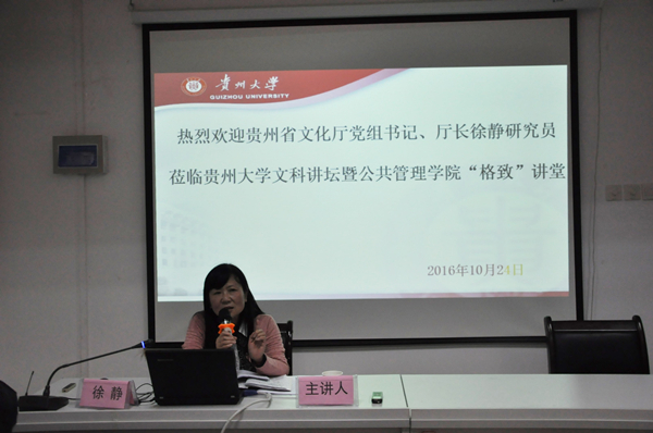 本网讯(新闻中心 励嘉伟 报道|摄影 李佳霜)10月24日晚,我院召开了主题为“习总书记关于哲学社会科学的重要工作讲话与哲学社会科学工作者的作为担当”的学术讲座。本次讲座由贵州省文化厅党组书记、厅长徐静研究员主讲,院党委书记李波主持。