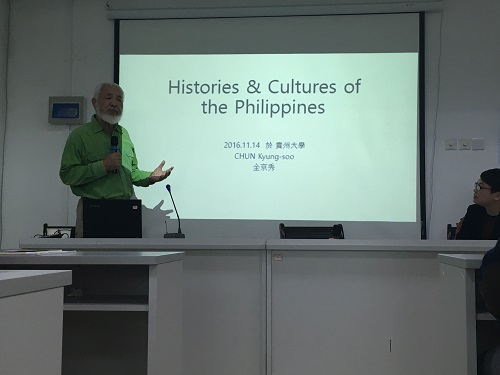 本网讯(研会宣传部 安江兰 报道|摄影 付登位)11月14日16:00,著名人类学家,韩国人类学学会原会长,韩国首尔大学教授,贵州大学东盟研究院特聘教授全京秀做客公共管理学院,在慎思楼710会议室为全院师生作了题为“菲律宾历史与文化”的精彩学术讲座,本次讲座由东盟研究院王勇博士主持。