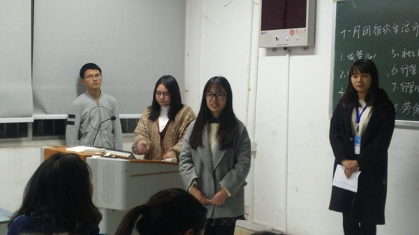 本网讯(新闻中心 实习记者 谯惠方 报道|摄影 史登辉)11月25日晚,公共管理学院于北校区博学楼117教室举行了以“爱校·荣校”为主题的团组织生活评比,院团委学生会杨鑫馨等主要学生干部参加了此次评估,经过初评,来自学院14级与15级的7个班级参与本次展示评比。