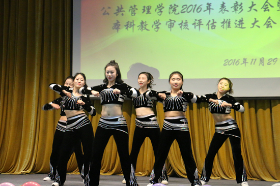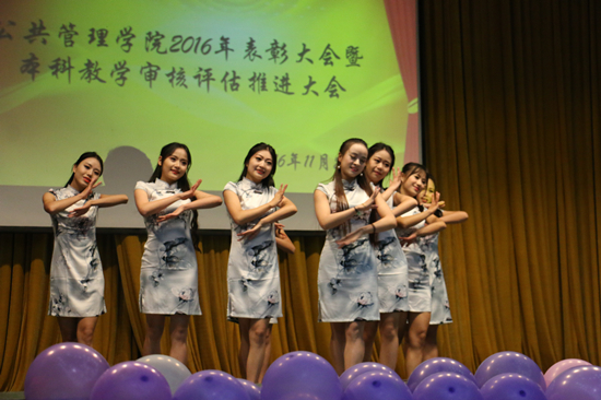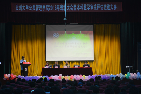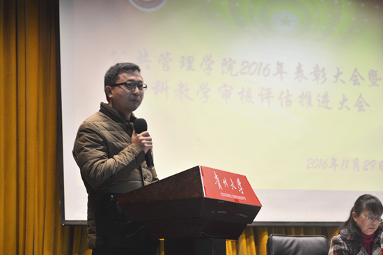 本网讯(新闻中心 杨清清 李科鹏 报道|摄影 胡顺书 席游)11月29日晚,公共管理学院“2016年度表彰大会暨本科教学审核评估推进大会”于北区大礼堂隆重举行。院党委书记李波,院长黄其松,副院长许鹿、王志凌、靳永翥及研究生科科长秦虹,学生科老师崔永霞、董淑琴、韩飞参加会议。
